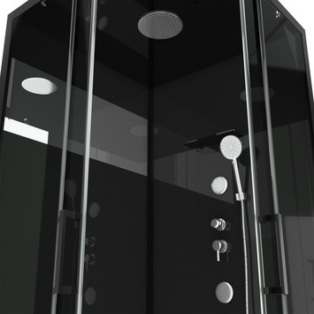 De ronde douchecabine Black Mirror van Aurlane is 90 op 90 centimeter groot. De moderne douchecabine maakt van je dagelijkse douche een écht verwenmoment. 't Beste van al? Je kan de ronde douchecabine Black Mirror installeren zonder siliconen. De cabine bestaat uit een centrale douchekolom, een douchebak, een douchedak, een voorzijde in zwart veiligheidsglas van 6 mm dik en een set achterwanden in zwart acryl. Tip: ook verkrijgbaar in andere vormen.