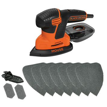 De mouse schuurmachine van BLACK+DECKER dankt zijn naam aan zijn driehoekige vorm, waarmee je overal op en tussen geraakt. De schuurmachine van 120 watt maakt 14.000 schuurbewegingen per minuut en heeft 3 rubberen grijpzones zodat je supercomfortabel kan schuren en polijsten. Inclusief opbergzak, schuurgaas en schuurvingers.