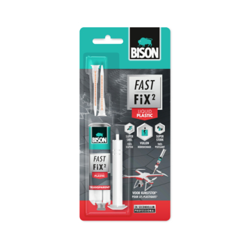 Bison Fast Fix² Vloeibaar Plastic is een snelle en sterke 2-componenten reparatielijm met spleet vullende eigenschappen op basis van cyano-technologie. Het is geschikt voor vele soorten reparatiewerkzaamheden van kunststof voorwerpen zoals PVC, Polystyreen, Polycarbonaat, ABS en PNMA, zowel twee dezelfde materialen onderling als combinaties met andere materialen zoals hout, keramiek, steen, rubber en glas. Zelfs voor niet passende oppervlakken. De gelformule maakt toepassingen in elke richting mogelijk.