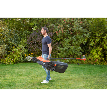 De BLACK+DECKER BEMW481BH-QS is een krachtige 1800W grasmaaier met een maaibreedte van 42cm. Door het speciale ontwerp kunt u volledig tot aan de rand maaien. Het nieuwe verbeterde ergonomisch handvat (bike handle) voelt erg prettig aan, ook na langer werken. De snijhoogte van de machine is zeer eenvoudig met een handbeweging in te stellen van 20 tot 70mm. Met ruime 50 liter opvangbak, dus je hoeft niet vaak te legen. Door de verbeterde vorm van het snijmes wordt het gras 80% beter opgezogen en in de opvangbak geblazen. Je krijgt hierdoor veel minder snel verstoppingen en de opvangbak wordt volledig benut waardoor je langer maait en minder leegt. Door het lage ontwerp heeft u een optimaal bereik onder struiken en meubels. Er zit een groot handvat in het midden van de machine zodat je 'm makkelijk kunt optillen. Compact en eenvoudig op te bergen door inklapbaar handvat.