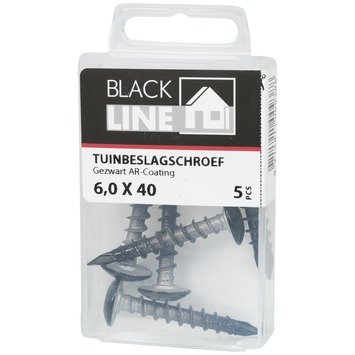 De Blackline schroef 6.0 x 40 zwart Kop T x 30 5 stuks heeft een hoge corrosiebestendigheid door de elektrolytische zinklaag met zwarte topcoating. Deze schroef is zeer geschikt voor de montage van zwarte tuinhengen en ander zwart tuin-en bouwbeslag. Kortom, een ijzersterke zwarte schroef voor een industriële touch.