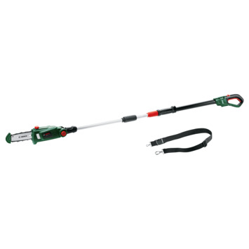 De Bosch accu hoogsnoeier UniversalChain 18 is perfect voor het snoeien van lastig bereikbare takken. Door de instelbare kop en telescoopstang van 2,1 tot 2,6 meter hoog, zaagt deze machine gemakkelijk door zelfs de hoogste takken. De tipbeschermer en bumperspike zorgen voor een goede controle. De ketingzaag werkt op een 18V / 2,5Ah Lithium-Ion accu, waardoor u snel aan de slag kunt zonder het gebruik van verlengsnoeren. Door het ergonomische, goed gebalanceerde en lichtgewicht design werkt u simpel en langdurig door zonder belasting op de armen en schouders. Met het zwaard van 20 cm snoeit u takken met een dikte tot 15 cm. Door de oliepeilindicatie en automatische kettingsmering wordt er voorkomen dat uw machine droogloopt.