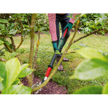 Snoeien van takken in je tuin is nog nooit zo makkelijk geweest met de AdvancedPrune 18V-45 snoeischaar! Deze krachtige snoeischaar vereist minimale inspanning bij het snoeien. Het slanke ontwerp en de unieke 360° schakelaar maken het eenvoudig om zelfs op de meest krappe plekken te snoeien, ongeacht de werkhoek. Roestvrijstalen messen maken het mogelijk om zacht hout tot wel 45 mm diktes te snoeien, wat resulteert in bevordering van een gezonde groei. Voor moeilijk bereikbare takken kun je de lengte van het gereedschap vergroten tot 1,8 m met behulp van de meegeleverde verlengsteel. De handige haak op het mes maakt het makkelijk om dikke en verstrengelde takken te bereiken en weg te snoeien. Volledig opgeladen heeft deze snoeischaar een Quick Cut-technologie bij het snoeien van takken tot 30 mm dikte, waardoor circa 600 bewegingen per snoeibeurt worden gemaakt met een snelheid van minder dan 1,2 seconden per tak. Dankzij de accuniveau-indicator op de handgreep kun je te allen tijde het vermogensniveau van de snoeischaar monitoren, zelfs tijdens het snoeien. De geïntegreerde Bosch Syneon-technologie zorgt voor optimale kracht en maximale looptijd bij het gebruik van de snoeischaar. Met het 18V POWER FOR ALL-systeem kun je met één enkele accu alle 18V POWER FOR ALL-gereedschappen gebruiken. Snoeien was nog nooit zo gemakkelijk en vermakelijk geweest als met deze snoeischaar!