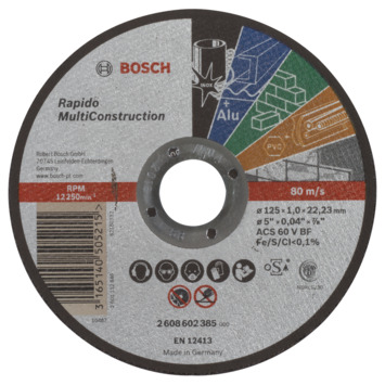 Doorslijpschijf recht Rapido Multi Construction ACS 60 V BF, 125 mm, 22,23 mm, 1,0 mm. Passend bij niet-stationaire haakse slijpmachines. Maximale omtreksnelheid: 80 m/s (afhankelijk van toerental en schijfdiameter). Fe/S/Cl <0,1%.