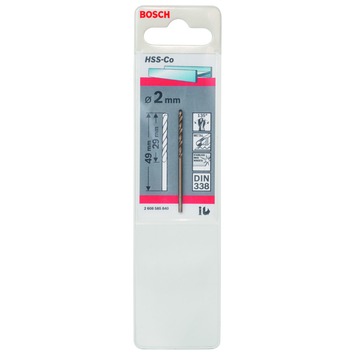 Met de Bosch metaalboor HSS-Co boor je moeiteloos door verschillende metalen. De boor van 2 mm diameter beantwoordt aan de DIN 338 norm. Vervaardigd uit staal met boorkop geslepen op 135°.