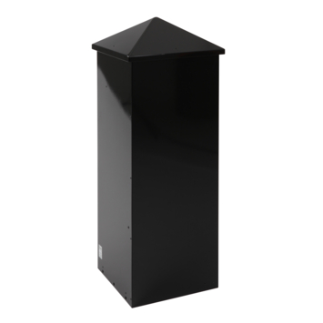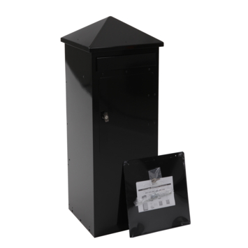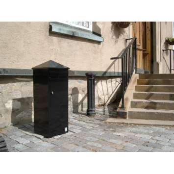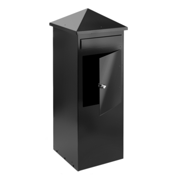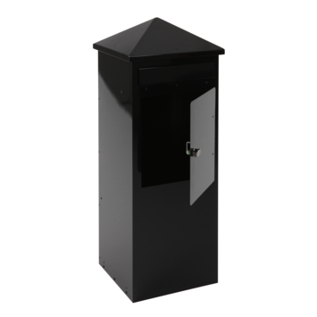Vierkante, robuuste brievenbus van staal met inworpopening (33 x 8 cm) en deur aan de voorzijde. De klep klapt naar binnen bij het inwerpen van de post. Brandveilig. Gewicht 24 kg.