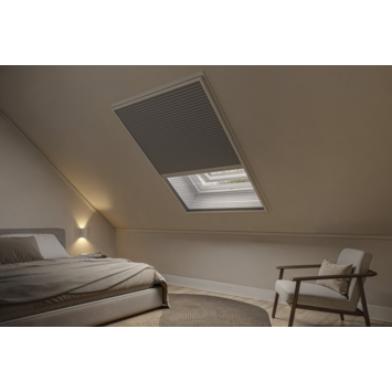De duo plissé S800 past op dakramen met een maximale opening van 73 × 155 cm en combineert praktische bescherming tegen insecten met sterke verduistering. Aluminium profielen in wit (RAL 9010) en de geplisseerde doeken in zwart en antraciet zorgen voor een nette montage in het kozijn. Let op dat de kanteling van het dakraam beperkt kan worden bij een volledig gesloten hor.