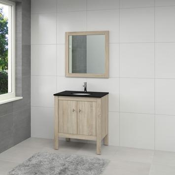 Badmeubelset Heros combineert klassieke elementen met strakke lijnen. Het wastafelblad is van graniet en combineert uitstekend met de oud witte of grijs eiken onderkast. De kasten hebben robuuste rechte vormen in combinatie met speelse grepen. De Heros kasten zijn hangend en staand leverbaar. Ze zijn extra diep (50 cm) en bieden daarmee volop ruimte. Deze Bruynzeel badkamermeubelset in grijs eiken bestaat uit een onderkast met 2 deuren, een granieten wastafelblad met een ronde uitsparing, een keramische/porseleinen wasbak en een grote vierkante spiegel met een krachtige lijst. Om de set compleet te maken is er een bijpassende kolomkast verkrijgbaar. Het badkamermeubel is 80cm breed en 50cm diep. Zowel de wastafelkast als de kolomkast worden als pakket geleverd en zijn eenvoudig te installeren dankzij de duidelijke montagehandleiding.