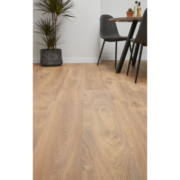 Het Bruynzeel laminaat Extra Breed Waterbestendig dapper donkerbruin is de ideale toevoeging aan jouw interieur. De vloer heeft een verfijnde uitstraling en is eenvoudig te combineren met verschillende woonstijlen. Het extra brede laminaat is 30% breder dan standaard laminaat. Aan alle zijden van de laminaatplank met voelbare houtstructuur bevinden zich V-groeven, waardoor deze de authentieke look krijgt van een echte houten plank. De vloer heeft een klikverbinding, waardoor het leggen van het laminaat gemakkelijk is en een naadloos effect oplevert. Bovendien kan het laminaat zwevend gelegd worden, zonder dat het aan de ondervloer gelijmd hoeft te worden. De laminaatvloer is in combinatie met de juiste ondervloer prima geschikt voor eventuele vloerverwarming aan de hand van warmwaterbuizen. Om valpartijen te voorkomen is het kliklaminaat antislip, waarmee het extra grip en stabiliteit biedt. Dit specifieke laminaat heeft als voordeel dat het geschikt is voor gebruik in vochtige ruimtes. Water kan gedurende een periode van maar liefst 48 tot 72 uur zonder problemen op de vloer blijven liggen. Het gebruik van HDF (High Density Fiberboard) als basismateriaal maakt dat het product PEFC gecertificeerd is, wat betekent dat het hout afkomstig is uit duurzaam beheerde bossen. Laminaat is daarnaast gemakkelijk schoon te maken en daarmee zeer onderhoudsvriendelijk. De laminaatvloer heeft een dikte van 8 mm, wat bijdraagt aan een goede stabiliteit en het product geschikt maakt voor zowel intensief commercieel gebruik als intensief woongebruik. Het product bevat 6 latten wat leidt tot een totale inhoud van 2.02 m².