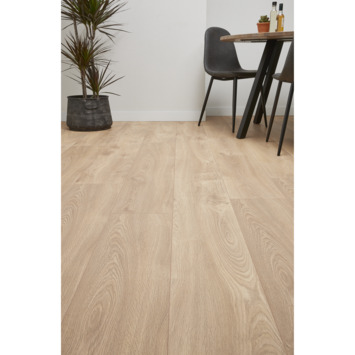 Ontdek de perfecte harmonie tussen elegantie en functionaliteit met het Bruynzeel laminaat Extra Breed Waterbestendig nieuwsgierig naturel. Waterbestendig laminaat van Bruynzeel is o.a. geschikt om te leggen in badkamers, keukens en andere ruimtes waar er nu en dan gemorst wordt. Alhoewel het een waterbestendige vloer betreft, werkt de vloer wel door wisselingen in luchtvochtigheid en adviseren we om de vloer nooit in zijn geheel onder water te zetten. Het waterbestendige laminaat is bestand tegen vocht voor een periode van 48 tot 72 uur. Desondanks adviseren we vocht direct te verwijderen bij het signaleren ervan. De nieuwsgierig naturel kleur geeft de vloer een rustieke uitstraling passend bij een verscheidenheid aan interieurstijlen. Vergeleken met regulier laminaat is het extra brede laminaat 30% breder. De laminaatplank heeft een voelbare houtstructuur en is voorzien van een V-groef aan alle zijden, waardoor het de look heeft van een authentieke plankenvloer. Met de klikverbinding leg je de laminaatvloer eenvoudig en naadloos zwevend, omdat deze niet op de ondervloer hoeft te worden verlijmd. In combinatie met de juiste ondervloer zijn laminaatvloeren ideaal voor vloerverwarming. Dit kliklaminaat is antislip en biedt daardoor extra stabiliteit en grip om vallen te voorkomen. HDF (High Density Fiberboard) is een supersterk basismateriaal dat PEFC-gecertificeerd is, wat betekent dat het afkomstig is uit duurzaam beheerde bossen. Laminaat is daarnaast gemakkelijk schoon te maken en daarmee zeer onderhoudsvriendelijk. De laminaatvloer heeft een dikte van 8 mm, wat bijdraagt aan een goede stabiliteit en het product geschikt maakt voor zowel intensief commercieel gebruik als intensief woongebruik. Het product bevat 6 latten wat leidt tot een totale inhoud van 2.02 m².