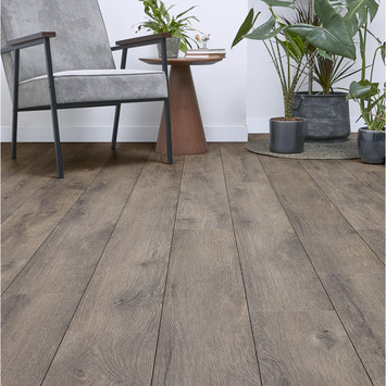 Het Bruynzeel laminaat Waterbestendig gedurfd grijs is de ideale toevoeging aan jouw interieur. Waterbestendig laminaat van Bruynzeel is o.a. geschikt om te leggen in badkamers, keukens en andere ruimtes waar er nu en dan gemorst wordt. Alhoewel het een waterbestendige vloer betreft, werkt de vloer wel door wisselingen in luchtvochtigheid en adviseren we om de vloer nooit in zijn geheel onder water te zetten. Het waterbestendige laminaat is bestand tegen vocht voor een periode van 48 tot 72 uur. Desondanks adviseren we vocht direct te verwijderen bij het signaleren ervan. De vloer heeft een verfijnde uitstraling en is eenvoudig te combineren met verschillende woonstijlen. De laminaatplank met een voelbare houtstructuur heeft een V-groef aan de lange zijde, waardoor het oogt als een authentieke plankenvloer. De vloer heeft een klikverbinding, waardoor het leggen van het laminaat gemakkelijk is en een naadloos effect oplevert. Bovendien kan het laminaat zwevend gelegd worden, zonder dat het aan de ondervloer gelijmd hoeft te worden. In combinatie met de juiste ondervloer zijn laminaatvloeren ideaal voor vloerverwarming. Dit kliklaminaat is antislip en biedt daardoor extra stabiliteit en grip om vallen te voorkomen. HDF (High Density Fiberboard) is een supersterk basismateriaal dat PEFC-gecertificeerd is, wat betekent dat het afkomstig is uit duurzaam beheerde bossen. Laminaat is daarbij door zijn reinigingsgemak zeer onderhoudsvriendelijk. De laminaatvloer heeft een dikte van 8 mm, wat bijdraagt aan een goede stabiliteit en het product geschikt maakt voor zowel intensief woongebruik als normaal commercieel gebruik. De verpakking bevat 8 lamellen wat resulteert in een totale inhoud van 2.13 m².