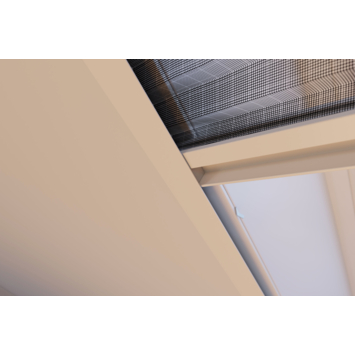Het compacte ontwerp maakt het vliegenraam eenvoudig te combineren met rolgordijnen, verticale lamellen of jaloezieën. De witte aluminium profielen (RAL 9010) en het zwarte geplisseerde gaas zorgen voor een strak en onderhoudsvriendelijk geheel. Bij dakramen wordt het vliegenraam geplaatst op de omliggende aftimmering, zonder dat het hang- en sluitwerk de bediening belemmert.