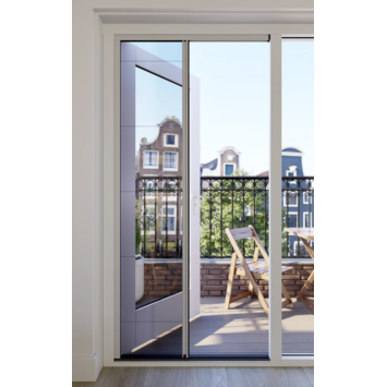 Dankzij de ondergeleider van slechts 10 mm blijft de doorgang laag en comfortabel. De afwerking bestaat uit een lichtgrijze kunststof cassette en bovenprofiel, een aluminium greeplijst in lichtgrijs RAL 7047 en een antracietkleurig kunststof onderprofiel. De vliegendeur is demontabel en eenvoudig schoon te houden met een kledingroller of een mild sopje van lauw water.