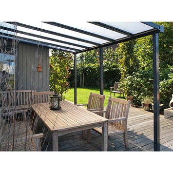 De terrasoverkapping bestaat uit antracietkleurige aluminium profielen en meerwandige polycarbonaat dakplaten met een dikte van 10mm. De overkapping is 549cm breed, 310cm diep. En de staanders zijn 225cm hoog.