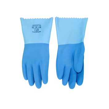 Latex handschoen met voering in 100% katoen. De elasticiteit garandeert een uitstekende pasvorm en draagcomfort. Lengte: 30 cm. Uitstekende greep op droge en natte voorwerpen. Deze handschoen biedt bescherming tegen diverse chemicaliën en is perfect vloeistofdicht.