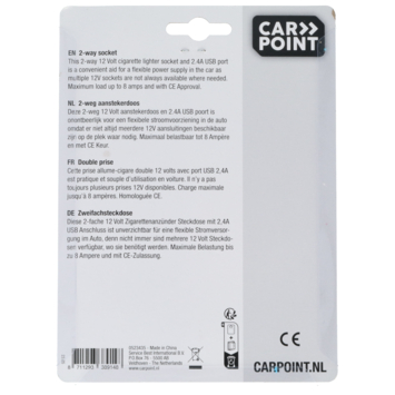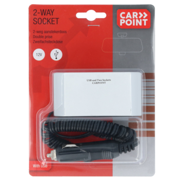 Carpoint 2-weg stekkerdoos met twee standaard 12 Volt sigarettenaansteker aansluitingen en één 5 Volt 2.4 Ampère USB aansluiting. Geschikt voor de standaard 21mm sigarettenaansteker aansluiting. De stekkerdoos is geschikt voor 12 Volt en heeft een kabellengte van 130 centimeter. Maximaal belastbaar tot 8 Ampère en met geïntegreerde vervangbare glaszekering in de plug.