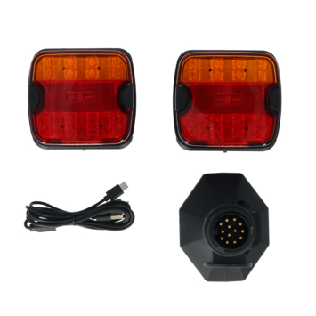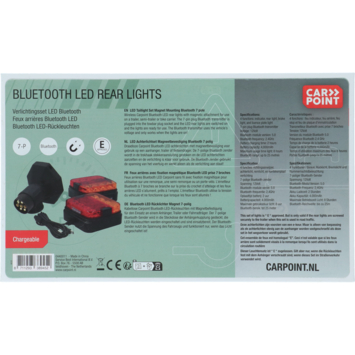 Draadloze Carpoint Bluetooth LED achterlichten met magneetbevestiging voor gebruik op een aanhanger, trailer of fietsendrager. De 7-polige Bluetooth zender in de trekhaak stekkeraansluiting steken en de LED achterlichten aanzetten en de verlichting is klaar voor gebruik. De Bluetooth zender gebruikt de spanning van het voertuig en werkt alleen als de verlichting aan staat! De achterlichten hebben 4 functies; richtingaanwijzer, achterlicht, remlicht en kentekenplaat verlichting. De verlichting is oplaadbaar met de meegeleverde USB kabel. Makkelijk op metalen oppervlakken te bevestigen met de magneetbevestiging.
