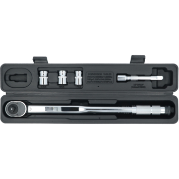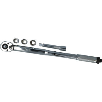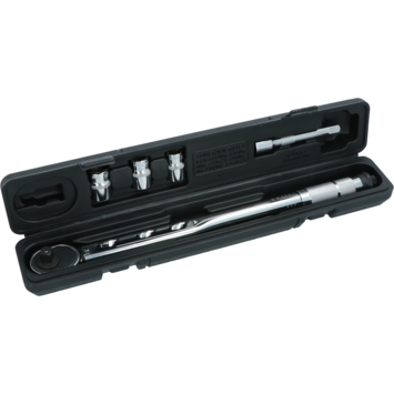 5-delige Carpoint momentsleutel set met een momentsleutelmet een lengte van 465 mm, 1/2"verlengstuk van 125 mm en drie verschillende doppen in de maten 17, 19 en 21 mm. De Carpoint momentsleutel is om bouten met een exact vooringesteld koppelmoment aan te kunnen draaien. Wanneer het koppel bereikt is, klinkt een kliksignaal.