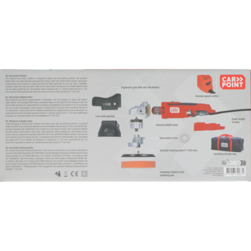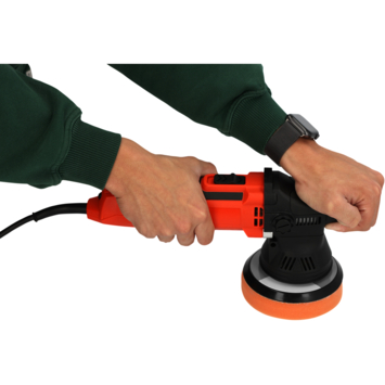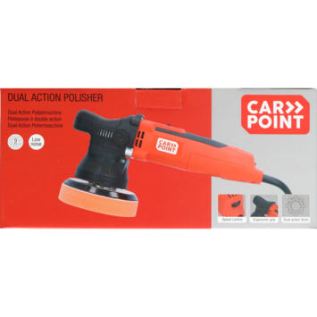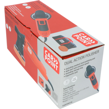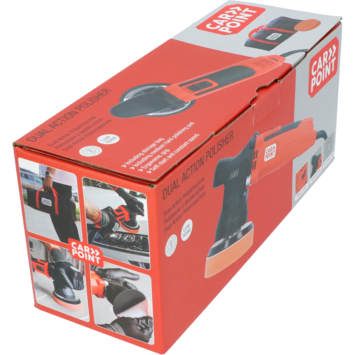 De Carpoint dual action polijstmachine is ontworpen voor het effectief verwijderen van lakdefecten, oxidatie, lichte krasjes en swirls of het aanbrengen van een polish en wax. De pad maakt gelijktijdig een draaiende en oscillerende beweging (Dual Action) en heeft een excentrische uitslag van 9mm waardoor zeer nauwkeurig gewerkt kan worden. De machine heeft 6 verschillende snelheden (polijstbewegingen: 2000-6400/min) die met de draaischakelaar traploos instelbaar zijn aan de achterzijde. Lees de gebruiksaanwijzing welke snelheid het beste te gebruiken is voor de verschillende werkzaamheden. De basisplaat heeft een diameter van 125mm, en door het klittenband op de backing plate zijn de pads makkelijk op en van de polijstmachine te halen. De poetsmachine heeft een vermogen van 650 Watt en weegt 2,2 kg. Eenvoudig aan- en uitzetten met de schakelaar bovenop de machine. Start en stop de machine altijd als hij in contact staat met het oppervlak. Houdt de polijstmachine stevig vast en laat de machine het werk doen, oefen geen extra druk uit. Te veel druk zorgt er voor dat de machine langzamer gaat werken en heeft een negatief effect op de kwaliteit van het werk.
