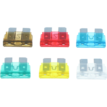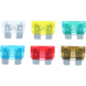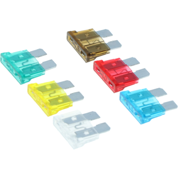 verschillende steekzekeringen met een bruine 7.5, rode 10, blauwe 15, gele 20,
