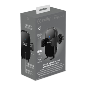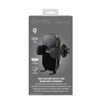 Mountcharge15 is de universele smartphone autohouder met verwisselbare basis voor ventilator of dashboard. Met de draadloze oplaadfunctie kan je apparaten opladen met een maximaal vermogen van 15 Watt. De auto-release knop opent automatisch de armen om je smartphone eenvoudig te plaatsen. 360° Swivel mount. Compatibel met alle smartphones tot 6,9 inch.