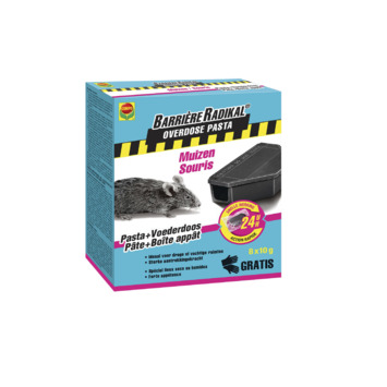 Barrière Radikal van Compo is een zeer snel en sterk werkend muizengif. Door de aantrekkelijke pasta is het gif vochtbestendiger dan bijvoorbeeld muizenkorrels. De speciale werkzame stof doodt door onderkoeling en verlamming. Het gif komt in 8 kant en klare zakjes van 10 gram die je zo, zonder openen, in de bijgeleverde voederdoos kan plaatsen. Daarnaast krijg je een paar handschoenen bijgeleverd zodat je niet met je blote handen aan het gif hoef te zitten en dat er geen menselijke geur op het gif terecht komt. Zet het gif neer op de looproutes van de muis langs bijvoorbeeld muren of dichtbij hun schuilplaatsen of eetplaatsen.