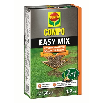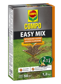 Compo Easy Mix doet 2 in 1. De slimme en snelle mix bevat graszaden en meststof met een lange werking om je uitgedunde gazon in 1, 2, 3 nieuw leven in te blazen. Ook geschikt voor het zaaien van nieuwe gazons. Gebruik biociden veilig. Lees vóór gebruik eerst het etiket en de productinformatie.