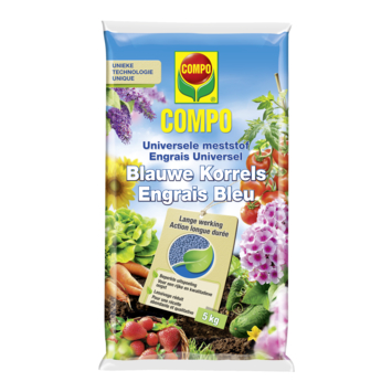 Wil je meer uit je moestuin halen? Doe dan een beroep op de universele meststof (5 kilo) van Compo. De blauwe meststof bevat alle vereiste voedings- en sporenelementen voor een hogere opbrengst in je moestuin. De meststof werkt 8 tot 10 weken.