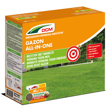 De Gazon all-in-one van DCM is een complete, stikstofrijke meststof die zorgt voor een vol, dicht gazon. Een vol gazon laat namelijk minder mos- en onkruidgroei toe. De meststof bevat ijzer en magnesium, wat zorgt voor een diepgroene kleur van je gras gedurende 100 dagen. Daarnaast is de meststof ook nog verrijkt met een hoog gehalte aan kalium waardoor je grasmat goed bestand wordt tegen droogte en betreding. De toegevoegde micro-organismen zorgen tenslotte voor meer bodemleven en een betere opname van voedingselementen. Deze verpakking van 3 kg is goed voor een oppervlakte van 60 m².