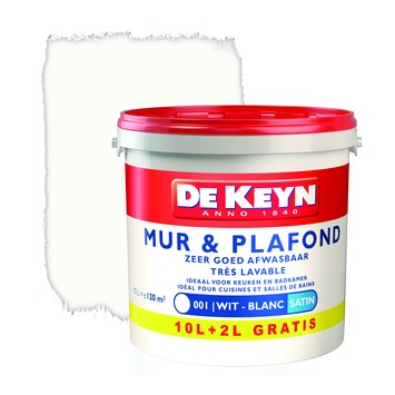 De Keyn Mur & Plafond is een hoogkwalitatieve zijdeglanzende muurverf op waterbasis. De verf is geschikt voor het gebruik in de keuken, badkamer of op andere plaatsen waar je muur afwasbaar moet zijn. Kies je favoriete kleurencombinatie door het uitgebreide kleurenpalet.