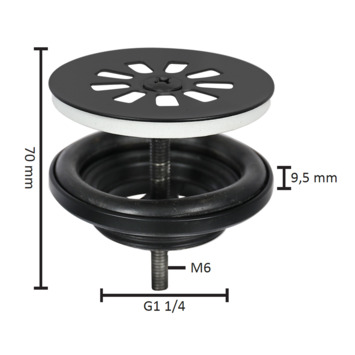 Breng je handenwasserset in je toiletruimte in één stijl met de afvoerpluggen van Differnz! De afvoerplug monteer je eenvoudig. De Differnz afvoerplug voor handenwasser mat zwart heeft een diameter van 65 mm en een hoogte van 70 mm en de schroefdraad heeft de maat M6. De afdichtingsringen voorkomen dat er lekkages ontstaan. Het messing materiaal heeft een mat zwarte afwerking.