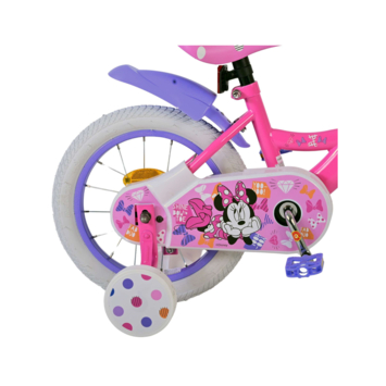 Laat je kind genieten van magische ritten met de Disney Minnie Cutest Ever! 14 inch kinderfiets. Deze roze fiets biedt alles wat een jonge fietser nodig heeft, of het nu gaat om leren fietsen of plezier maken. Met een handrem, terugtraprem en een gesloten kettingkast is veiligheid gegarandeerd. De afneembare zijwieltjes zorgen voor extra balans, waardoor de eerste ritjes soepel verlopen.