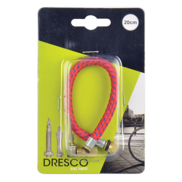 De Dresco pompslang is eenvoudig op iedere framepomp aan te sluiten en hierdoor kunnen verschillende soorten banden opgepompt worden. Deze 20 centimeter lange pompslag met extra verloopnippel is hierdoor geschikt voor banden met een Presta, Schrader, Dunlop en Blitz ventielen. De naald adapter maakt het mogelijk voetballen op te pompen.
