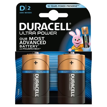 Duracell Ultra Power D batterijen zijn alkaline batterijen die ideaal zijn voor het aandrijven van veelgebruikte apparaten met een lange looptijd en een voortdurende vraag naar energie en vermogen. Ze zijn onze meest geavanceerde batterijen en hebben meer vermogen dan andere D batterijen, waardoor ze een superieure prestatie bieden voor al jouw behoeften. Daarnaast maakt de Powercheck technologie het gemakkelijk om te controleren hoeveel energie er in iedere batterij over is: je drukt eenvoudigweg aan weerszijden op de witte stippen en ziet de overgebleven hoeveelheid energie in de energiemeter. Deze D batterijen zijn de beste keuze wanneer je op zoek bent naar betrouwbare en duurzame energie in energieverslindende en veelgebruikte apparaten, zoals grote zaklampen, radiotransmitters, megafoons, radio's, gemotoriseerd speelgoed, etc. Duracell Ultra Power D alkaline batterijen zijn onze meest geavanceerde batterijen met Powercheck? (voor alkaline D grootte) en zijn tevens verkrijgbaar in AAA, AA, C en 9V.