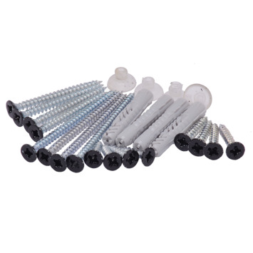 Plug 6mm (4x), schroeven 45mm(4x), 60mm(4x),16mm(4x), 25mm(4x), dopjes (4x)