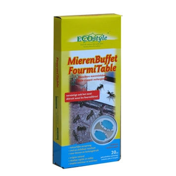 Bye bye mierennesten dankzij mierenbuffet (2 stuks) van ECOstyle. Deze navulbare mierenlokdoos vernietigt niet alleen de mieren, maar ook het nest. Geschikt voor binnen- en buitengebruik met een snel en efficiënt resultaat. Tip: wees voorzichtig met het gebruik van biocides. Lees het etiket en de productgegevens voor elk gebruik.
