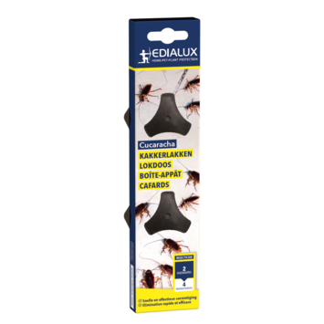 Cucaracha Kakkerlakken Lokdoos is een insecticide gel-lokaas voor de bestrijding van kakkerlakken in huizen, appartementen, kelders, openbare gebouwen, vervoermiddelen, opslagplaatsen... Plaats de lokschotel tussen voedselbronnen of op warme (50°C) en vochtige schuilplaatsen (hoeken, naden, kieren, achter panelen en apparaten, rondom pijpen/leidingen).