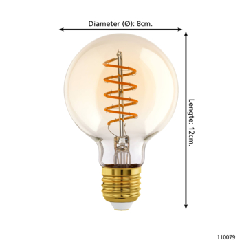 De Eglo LED lichtbron Amber voor gebruik in diverse armaturen heeft een Ø van 8 cm. De lichtbron is dimbaar en is een decoratieve lamp die gezien mag worden. De lichtbron van goudkleurig glas en de spiraalvormige draad past in bijna elke interieurstijl. Door de grote fitting (E27) past deze lamp in de meeste armaturen. Het wattage van deze globe is 4 Watt, en de lichtopbrengst is 245 lumen. De kleurtemperatuur is met 2000K warm te noemen.
