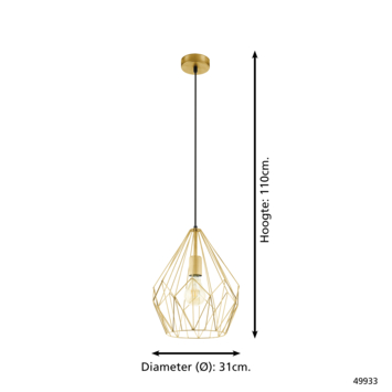 De Eglo hanglamp Carlton is speciaal ontworpen voor gebruik met een E27 lichtbron. Deze hanglamp is vervaardigd uit metaal en straalt in een gouden tint. De lamp heeft een piramidale vorm, volledig uitgevoerd in goud. De hanglamp heeft een diameter van 31 cm. Omdat de lichtbron niet is inbegrepen bij deze Hanglamp Carlton, heb je de mogelijkheid om zelf te kiezen voor een dimbare lichtbron. Deze kan vervolgens worden gedimd met behulp van een externe dimmer. De gouden hanglamp van Eglo bezit een antiek aandoende uitstraling, wat resulteert in een klassiek element binnen het interieur.