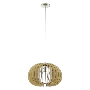 De Eglo Cossano hanglamp is exclusief gemaakt voor de E27 lichtbron. Deze hanglamp wordt gekenmerkt door een bijzondere lampenkap vervaardigd uit geperst hout. De lampenkap heeft een gebogen vorm met doorschijnende delen, wat een speels effect in de ruimte creëert. In een combinatie van lichtbruine en mat nikkel kleurige details straat de hanglamp elegantie uit. Je kunt de lengte van de hanglamp aanpassen naar wens. De lampenkap heeft een diameter van 45 cm.