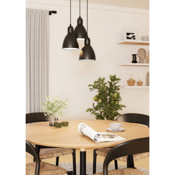 De Eglo hanglamp is exclusief voor de E27 lichtbron. De hanglamp heeft 3 lichtpunten die een diameter hebben van 32,5 cm. De hanglamp is gemaakt van metaal en is volledig in het zwart. De binnenkant van de lampenkappen hebben een lichte kleur. De hoogte van de lamp kun je zelf bepalen tot maximaal 110 cm. Je past eenvoudig de hoogte van de draden aan voor je Priddy aan het plafond hangt. Sluit deze lamp aan op een dimmer (niet meegeleverd) om op elk moment de juiste sfeer te creëren.