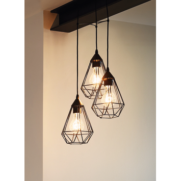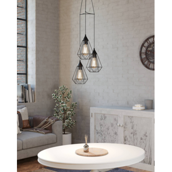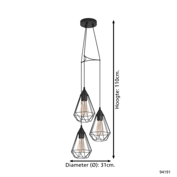 De Eglo hanglamp Tarbes is exclusief voor de E27 lichtbron. De hanglamp heeft 3 lichten, waarvan elke lampenkap een diameter heeft van 31 cm. De lampenkappen hebben gaten in de kap waardoor het licht de hele ruimte verlicht. Omdat bij de hanglamp de lichtbron niet wordt meegeleverd, kan jezelf kiezen voor een dimbare lichtbron. Met een externe dimmer kan je deze vervolgens dimmen. De lengte van de hanglamp kan tot 110 cm in hoogte versteld worden.