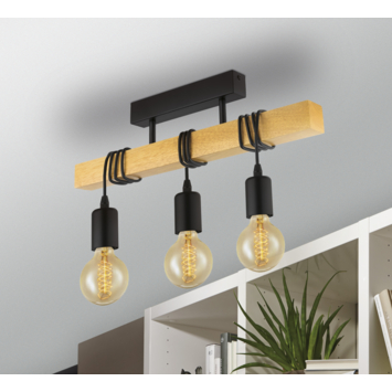 Met deze hanglamp heb je een moderne sfeermaker in huis. De lamp is gemaakt van hout en zwart staal en heeft daardoor een industrieel effect. De lamp voor aan het plafond bestaat uit drie lampen die elk aan een draad bevestigd zijn. Deze lampen met draad kun je naar eigen smaak om de houten balk wikkelen. Hierdoor kun je dus zelf kiezen hoe hoog de lampjes moeten komen te hangen. De lamp heeft E27 fittingen, is 26,5 cm hoog en is zeer geschikt voor diverse woonkamers. Kortom: met de Eglo Townshend hanglamp heb je een robuuste en moderne lamp in huis.