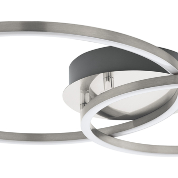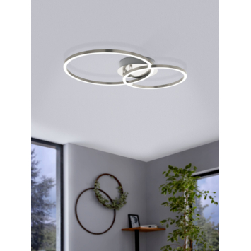 De plafondlamp Palmaves 1 CCT-LED van metaal in staallook heeft twee ronde verlichtingselementen van verschillende grootte. De achter de witte plastic kapjes geïntegreerde LED's kunnen met de meegeleverde afstandsbediening eenvoudig van functioneel wit licht aangepast worden naar aangenaam warm wit licht. Ook kun je deze plafondlamp dimmen of op een timer zetten via deze afstandsbediening. Dankzij het minimalistische ontwerp biedt deze plafondlamp moderne verlichting in elke ruimte, of het nu gaat om een keuken, woonkamer, slaapkamer, hal of eetkamer.