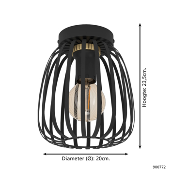 De decoratieve Eglo plafondlamp Pocicas zwart goud is gemaakt van staal en afgewerkt in het zwart met goudkleurige details. De lamp heeft een diameter van 20 cm en heeft een hoogte van 23,5 cm. De lamp is uitgevoerd met een E27 fitting en wordt geleverd exclusief lichtbron. De fitting is geschikt voor lichtbronnen met een maximaal vermogen van 40 watt.