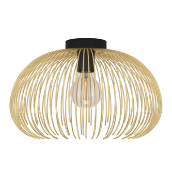 De plafondlamp Venezuela bestaat uit een gouden draadkap en een ronde zwarte metalen voet. De draadkap omhult de lamp binnenin met haar harmonieuze rondheid, waardoor een fascinerend spel van licht en schaduw ontstaat zodra het licht wordt ingeschakeld. Deze plafondlamp vult moderne interieurs aan en zorgt voor stijlvolle verlichting in elke ruimte, of het nu gaat om een keuken, woonkamer, slaapkamer of hal. De afgebeelde lichtbron is niet inbegrepen. De lamp is compatibel met elke E27 lamp.