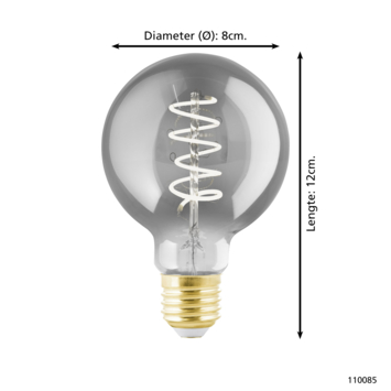 De Eglo LED lichtbron smoke voor gebruik in diverse armaturen is 8 cm. De lichtbron is dimbaar en is een decoratieve lamp die gezien mag worden. De lichtbron van goudkleurig glas en de spiraalvormige draad past in bijna elke interieurstijl. Door de grote fitting (E27) past deze lamp in de meeste armaturen. Het wattage van deze globe is 4 Watt, en de lichtopbrengst is 100 lumen. De kleurtemperatuur is met 2000K warm te noemen.