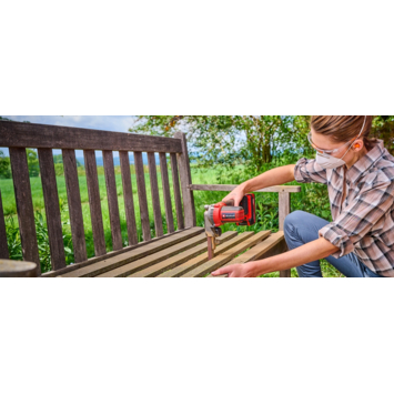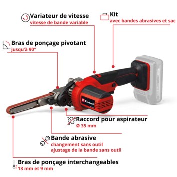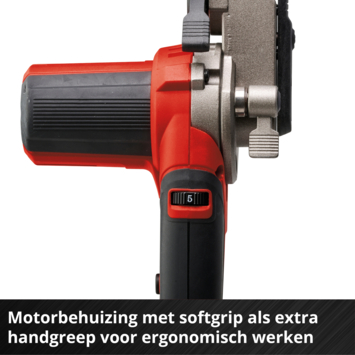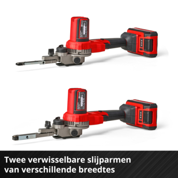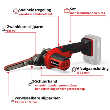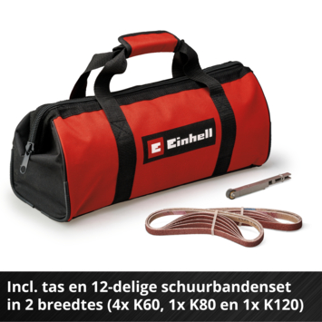 De Einhell accu-bandvijl TE-BF 18 Li-Solo is een praktisch, handzaam gereedschap om lastig toegankelijke plaatsen te vijlen en ontbramen. Als onderdeel van de Power X-Change productlijn kun je de bandvijl met alle accu's en opladers van de productlijn combineren. Deze wordt geleverd met twee wisselbare schuurarmen met verschillende breedtes. De 9 mm slanke schuurarm is perfect geschikt voor vernauwingen en voor het schuren van zeer kleine, filigranen werkstukken. Met de 13 mm brede schuurarm kun je ook bredere, platte oppervlakken bewerken. Voor flexibel werken vanuit diverse posities en voor het bewerken van lastig toegankelijke plaatsen kun je de schuurarm maximaal 90° zwenken. Dankzij de toerentalregeling pas je de schuurbandsnelheid tussen 250 en 1700 m/min aan het betreffende materiaal en het gewenste grote schuurvermogen aan. Daardoor is deze geschikt voor de meest uiteenlopende materialen. Voor tijdrovende werkzaamheden beschikt de handzame en lichte accu-bandvijl over een vergrendeling voor continubedrijf. Je wisselt de schuurband zonder gereedschap met de hendel en stelt de loop met de schroef aan de schuurarm af. Dankzij zijn ergonomisch design met softgripvlakken ligt de bandvijl prettig in de hand. De robuuste motorbehuizing heeft een softgrip en wordt zo een extra handgreep voor een optimaal gebruik. De schuurbandbehuizing bestaat uit massief metaal. Voor schoon werken wordt een afzuigadapter meegeleverd voor het aansluiten van bijvoorbeeld Einhell nat-droogzuigers. Inbegrepen zijn een 12-delige schuurbandenset in twee bandbreedtes (lengte 457 mm, elk 2x P60, P80, P120), twee schuurarmen en een praktische transport- en opbergtas. Geleverd zonder accu en oplader. Deze zijn apart verkrijgbaar.