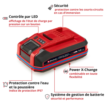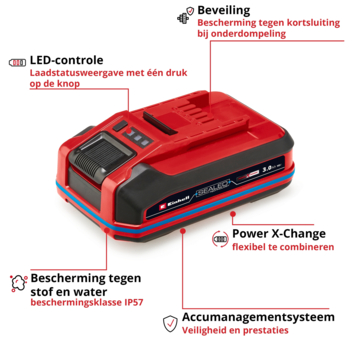 Met de Einhell Accu 18V/3.0Ah SEALED Plus accu haal je een krachtige en veelzijdige batterij in huis, die onderdeel is van het innovatieve Power X-Change systeem. Of je nu in de tuin werkt of in de werkplaats bezig bent, deze accu voorziet al je machines van het nodige vermogen en uithoudingsvermogen. Wat deze accu bijzonder maakt, is de SEALED technologie. Dankzij de afgedichte behuizing is de accu beschermd tegen stof en waterstralen volgens de IP57-norm. Zelfs na een volledige onderdompeling in water blijft de accu bruikbaar, dankzij het slimme sensorsysteem dat kortsluiting voorkomt.