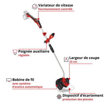 De Einhell accu-grastrimmer GE-CT 18/33 Li E-Solo gaat de uitdagingen aan in de tuin rond de kanten van gazons, vernauwingen of randen. De draadspoel van de trimmer heeft een draad met een lengte van 8 m en een dikte van 2 mm en wordt aangedreven door een krachtige motor met een stationair toerental van maximaal 7000 t.p.m. Dankzij de tikautomaat wordt de draad zonder handmatig aanspannen snel en eenvoudig naar buiten geleid. Met behulp van de lichte, aluminium duwboom, de extra handgreep en de draagriem met ingebouwde vulling biedt de accu-trimmer tijdens het werk maximaal comfort en houvast. Door een aan een uiteinde licht gebogen duwboom zijn de motorkop en de snij-eenheid perfect gepositioneerd voor de beste snijresultaten. De hoofdgreep loopt ook enigszins haaks, zorgt daardoor voor een perfecte positie van het polsgewricht en voorkomt vermoeidheid. Met behulp van de 2-traps toerentalregeling kun je het motortoerental aanpassen aan het telkens te maaien gras. Zelfs lang gras is dan geen probleem. Tijdens het gebruik beschermt de Flowerguard andere planten tegen mogelijke beschadigingen, zoals bloemen, struikjes of zelfs boomschors. Ook de gebruikte Power X-Change accu wordt door een stevig, stalen frame tegen schade van buitenaf beschermd. De deelbare duwboom zorgt voor een ruimtebesparende opslag van de grastrimmer. De accu-grastrimmer wordt zonder accu en zonder oplader geleverd. Deze zijn apart verkrijgbaar.